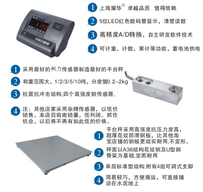 電子式地上衡由稱重傳感器、承重臺和稱重顯示器組成。可以放置在堅實地面上進行稱量,也可安放在淺基坑上或在其兩側加裝帶有一定坡度的引道,供手推車稱重使用.